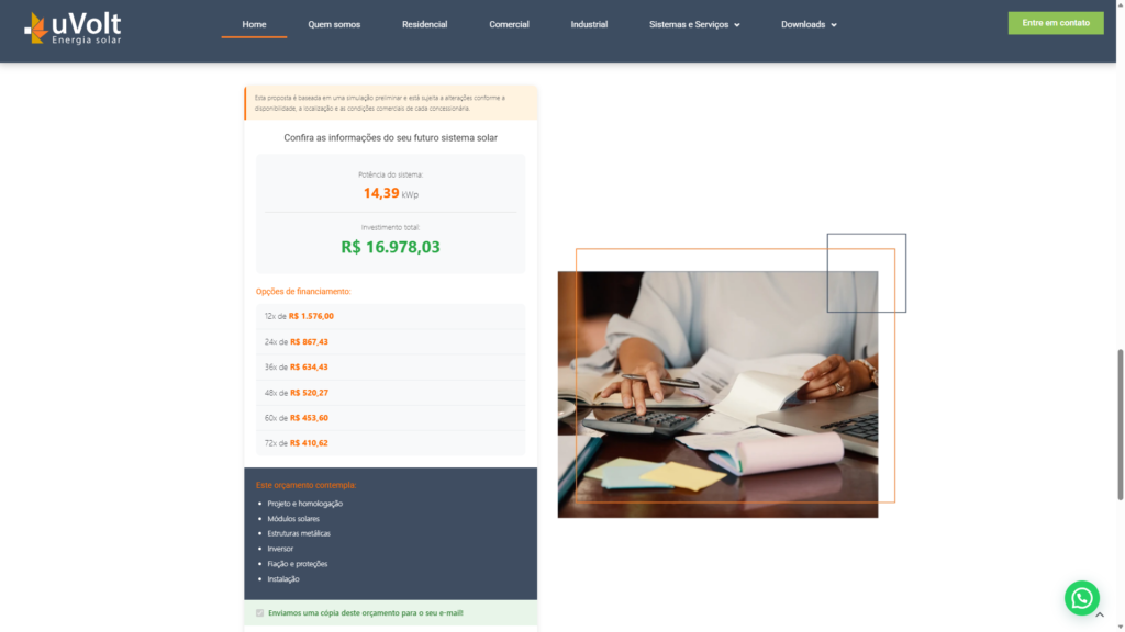 Esses leads já chegam mais preparados. Eles conhecem uma estimativa de investimento, entendem o prazo de retorno e sabem qual pode ser o valor da parcela. O departamento comercial atua com muito mais eficiência, focando apenas em oportunidades reais.