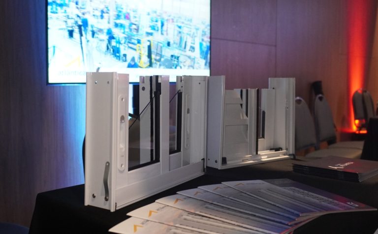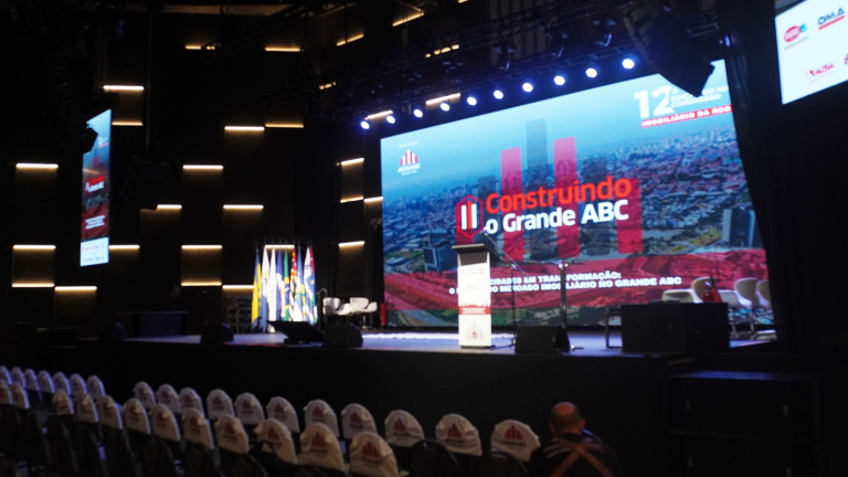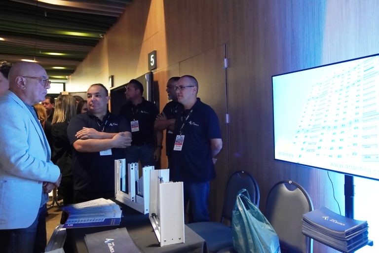 Paralelamente ao material físico, desenvolvemos um vídeo institucional exibido no telão do evento durante a programação. O conteúdo apresentou a Atlântica e o grupo como um todo, destacando diferenciais estruturais, capacidade produtiva e o histórico de obras na região. Esse movimento ampliou o alcance da mensagem para além da ativação física, construindo percepção de marca de forma integrada.