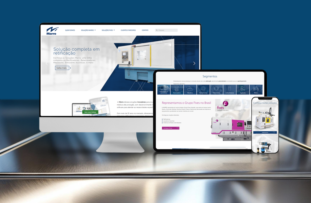 O primeiro passo foi a reconstrução do site institucional. Reestruturamos a arquitetura de informação, valorizamos a apresentação da empresa e organizamos melhor os conteúdos técnicos. O novo layout trouxe mais clareza, sofisticação visual e coerência com o porte da Marro Máquinas.