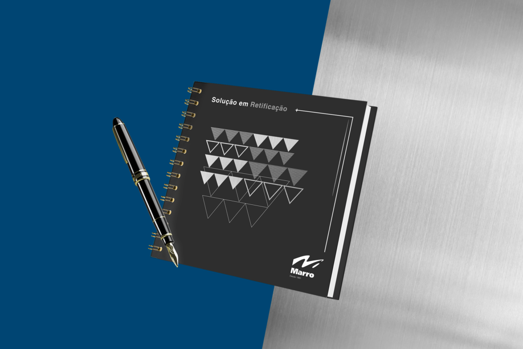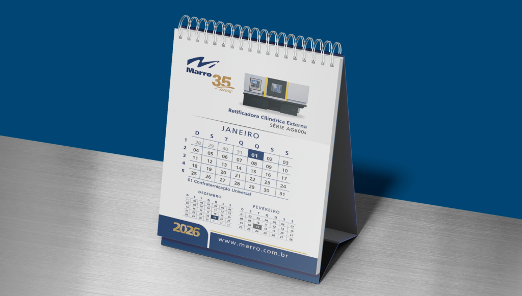 Outro ponto importante do projeto é a continuidade do trabalho. Há alguns anos desenvolvemos anualmente a agenda institucional da Marro Máquinas, renovando o layout a cada edição. Também criamos o calendário de mesa, entregue aos clientes como brinde corporativo. Esses materiais mantêm a marca presente durante todo o ano no ambiente de trabalho dos clientes, reforçando lembrança, proximidade e autoridade de forma constante.
